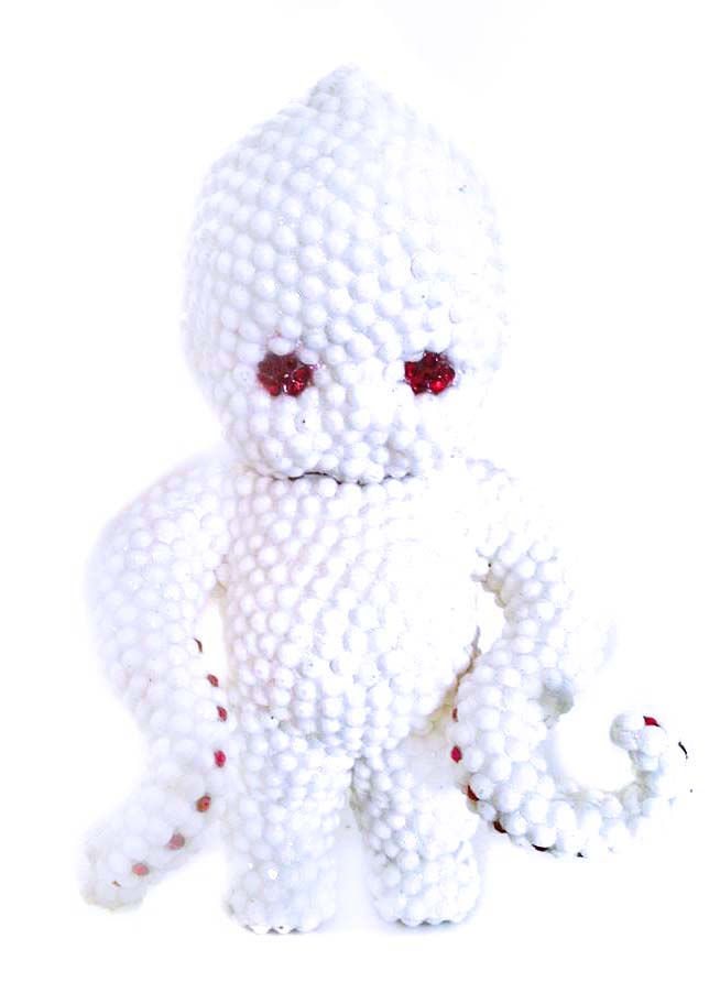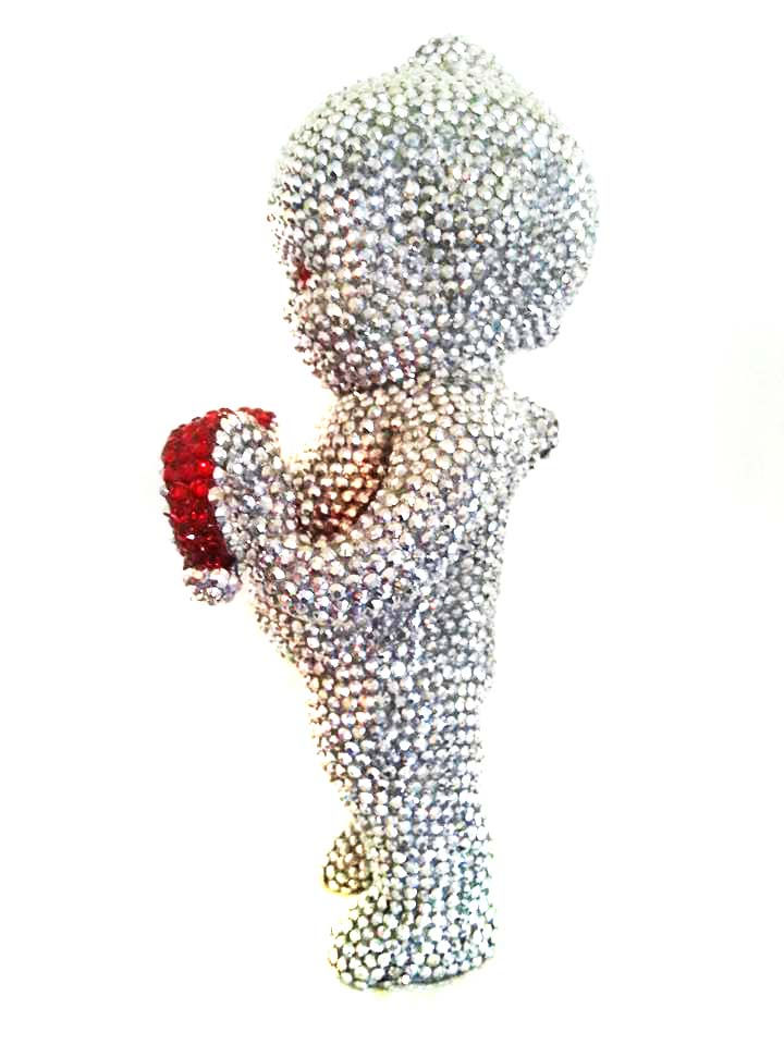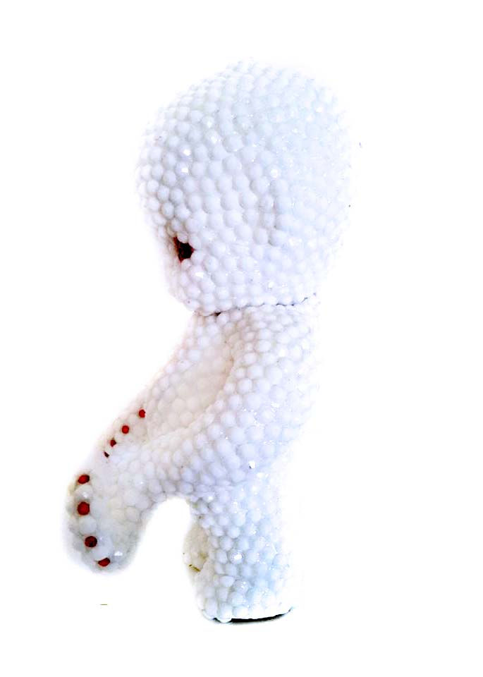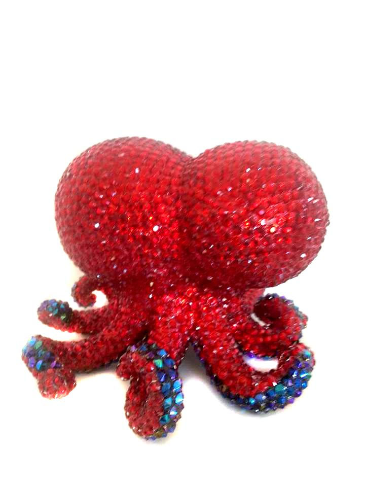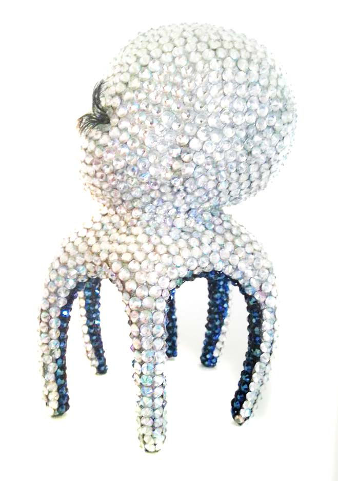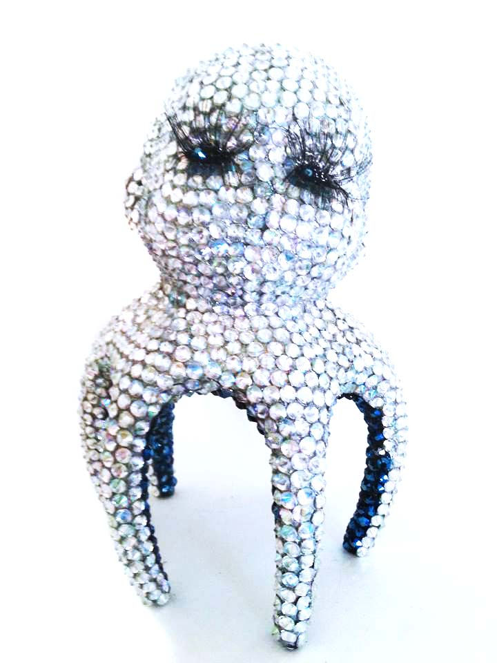 My recent two series, “Octobabies from Outer-space” & “Tranimals” explore my fascination with other worldly beauty and exterritorial cuteness. I take inspiration from action vinyl and vintage toys of my childhood as well as Street and Pop art of various eras. I then like to infuse them with a nostalgic sense of dark glamour and alien corruption. These may be creatures that may have sprung from the bottom of an alien ocean and the mutant drag queens here to protect us. Or maybe these masked vixens don’t have the best intentions after all? Maybe these squid-babies are here to warm up after their journey through outer-space? Good or Evil, the encrusted beauty is sure to captivate it’s viewer.